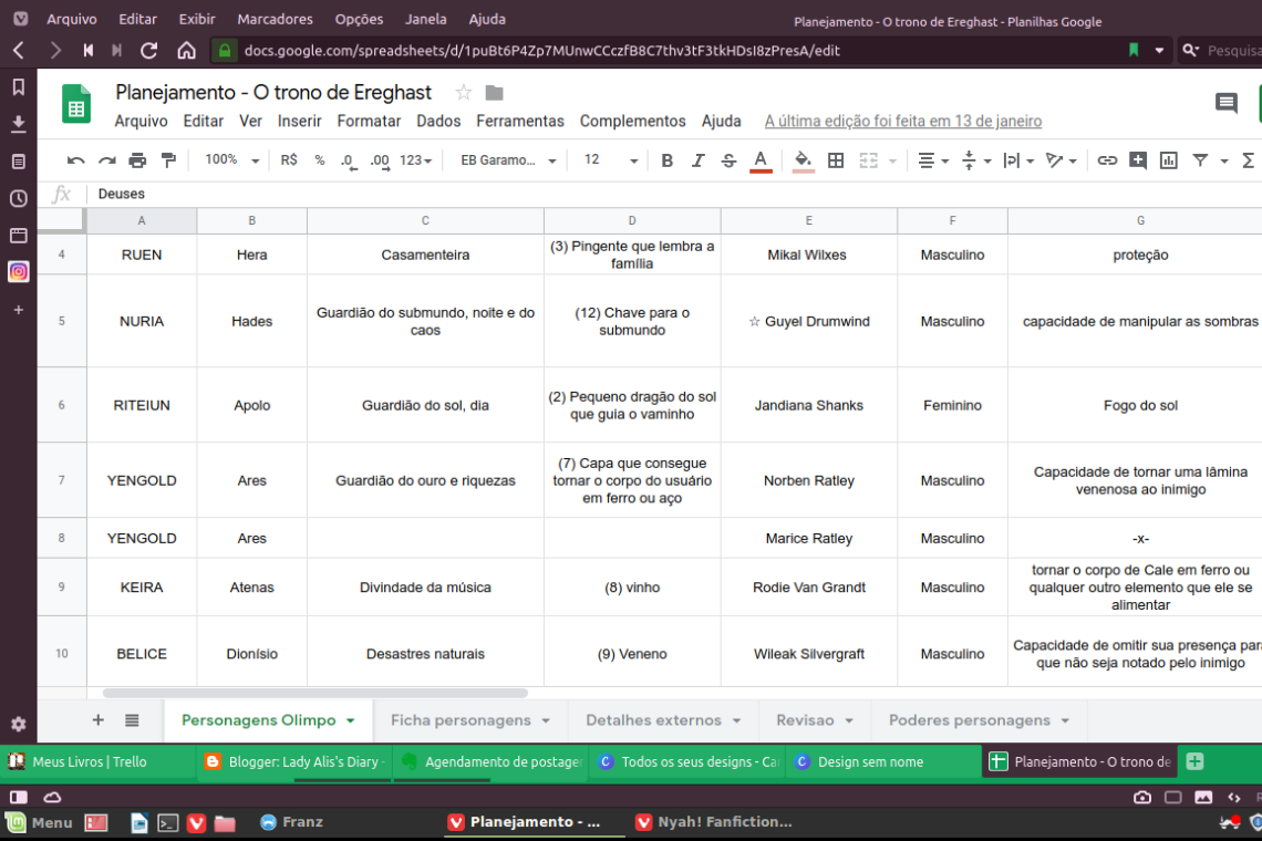 Nesse caso, a planilha irá conter a estrutura dos 3 atos, a ficha de todos os personagens, nomes de cidades e objetos (porque as vezes acontece de eu estar escrevendo e precisar nomear um lugar e tal), e a ficha de revisão.